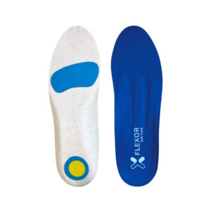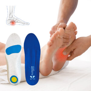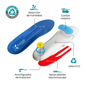Fasciitis insoles based on ECO latex and absorbent Flex-Steam lining. Contains a neuromuscular fasciitis pad that provides an offloading effect on the plantar fascia area. In the heel, it has a propulsion blue Poron ring and a containment yellow core that provides the effect of cushioning and comfort.