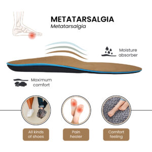 Molded insoles with comfort metatarsal pad and metatarsal pad for transverse arch elevation. It combines structuring materials with elements in soft latex (20-25º Asker C), microurethane and non-slip base.
