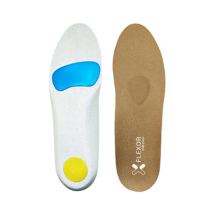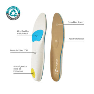 Metatarsalgia insoles based on ECO Latex and absorbent Flex-Steam lining laminated with impact absorption Latex that offers comfort. At the base it has a metatarsal discharge, and at the heel an absorption button.